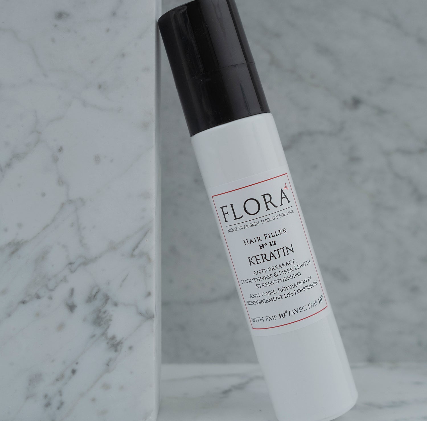 2. For all hair types, especially hair with surface damage, frizzy hair, brittle thick/curly hair: Spray 15 to 20 times on washed, towel-dried (still damp) hair after using a Flora shampoo or scrub. Apply section by section, avoiding the scalp. Follow up with a Flora conditioner or Intensive Repair Mask, massaging the product into the hair lengths but not the scalp. Add some water to emulsify and help ingredients to penetrate better. Rinse thoroughly. Detangle. Follow with your prescribed Flora Scalp Serums and Flora Heat Protection.